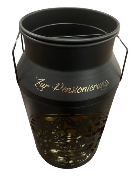 Das Motiv zeigt ein Schweizer Chalet mit Steinböcken vor der Kulisse der Alpen. Der Alpaufzug mit den Kühen sowie die Szenerie mit Musik & Tanz runden diese Milchkannen-Laterne ab.
